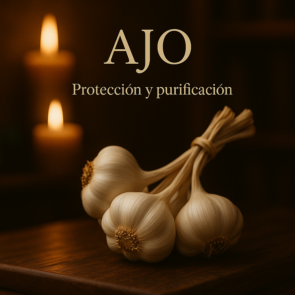 Ajo: repele la negatividad, limpia ambientes cargados y protege contra la envidia y el mal de ojo. También se asocia con la purificación y la fortaleza energética.
